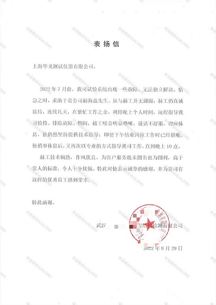 品質(zhì)與服務(wù):客戶發(fā)表?yè)P(yáng)信對(duì)華龍的技術(shù)服務(wù)予以肯定
